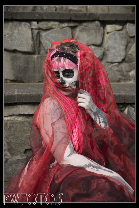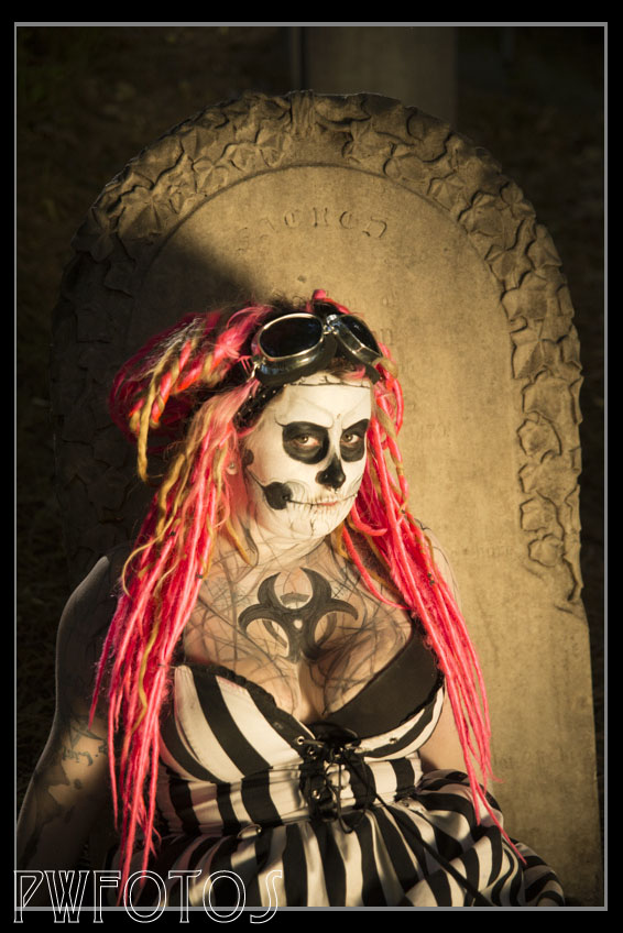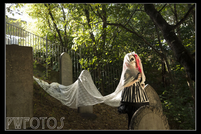 She approached me with the idea of doing a shoot where she was painted up to look like a skeleton. I suggested that we shoot it in Bolton Cemetery in Wellington which is quite old and also has the advantage that most of the headstones are not actually over the graves, as most were repositioned when the motorway went through the site in the 1970’s.