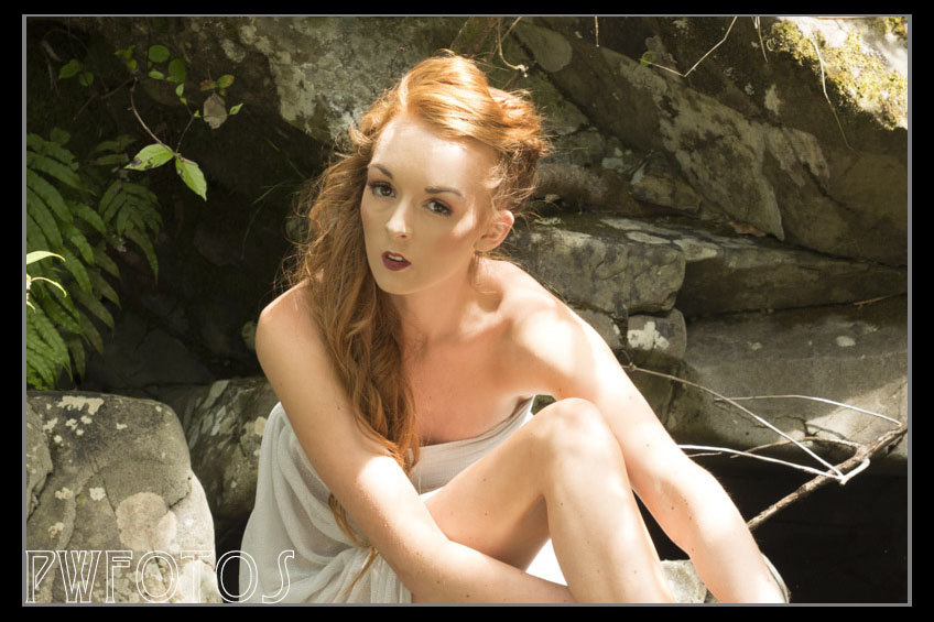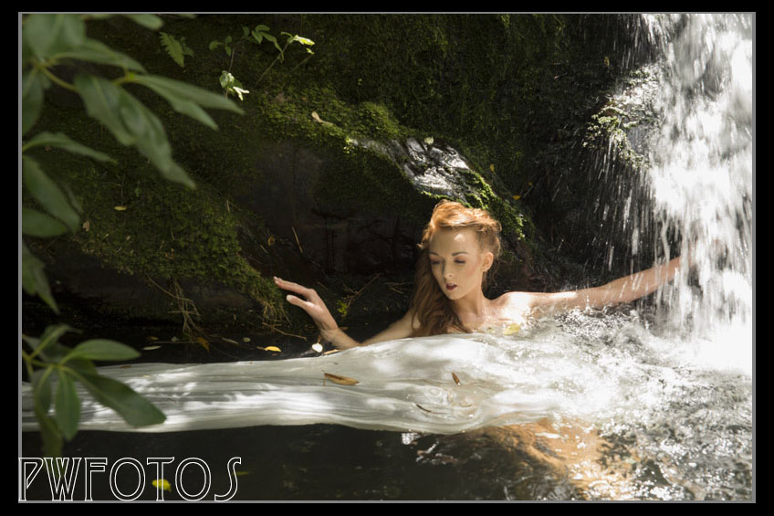 The day was perfect and the whole shoot went really well, apart from me slipping on a rock and coming away with a few grazes. We started on the rocks and then like a professional she moved into the water and then in the pool at the base of the falls. She was not concerned about the cold but was a little worried as to whether the stream had any eels in it. The location has really nice lighting at the top but was a little dark once we moved to the lower pool. This was easily remedied by getting Issy to use a reflector and shine it into the area. We used the gold side to create a very warm light.