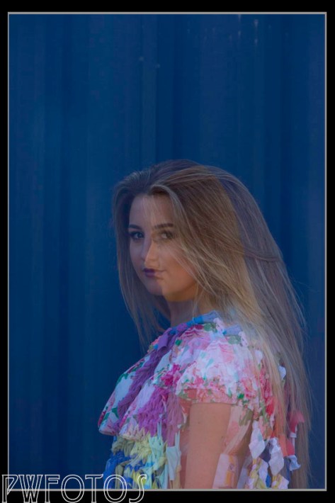 She is mainly a natural light photographer so when the weather delivered a much better result than was forecast we all headed outside into a car park where some large blue containers provided an interesting background.