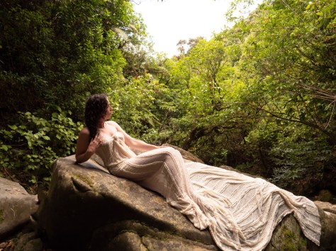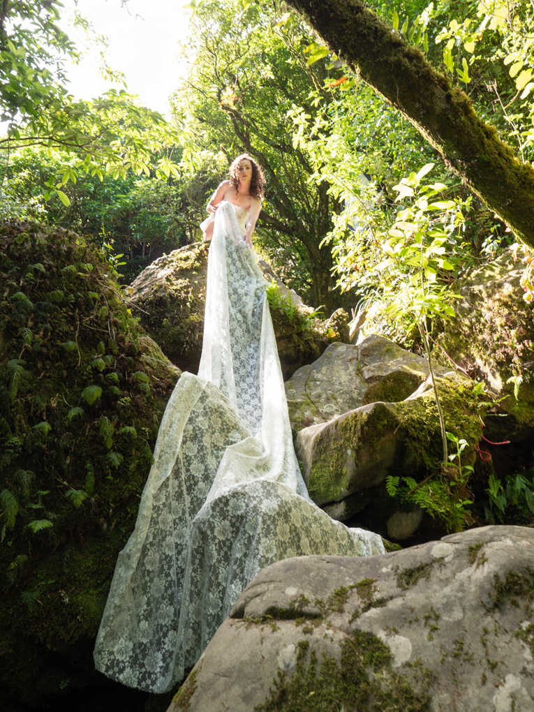 One of the fabrics we had brought was a 5m length of white lace so we decided to sit Katy on the rocks on the first level and drape it down and shoot it from above.