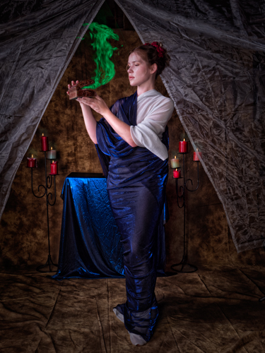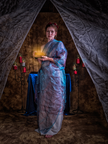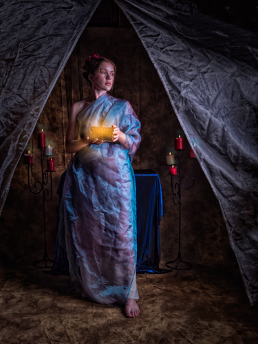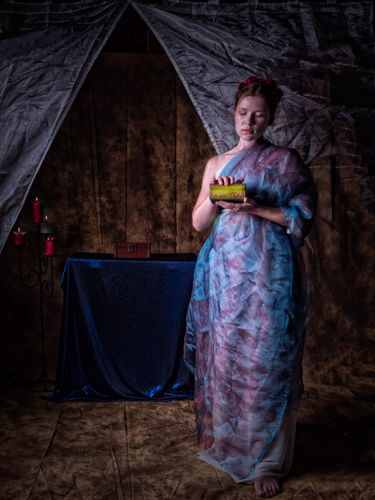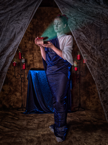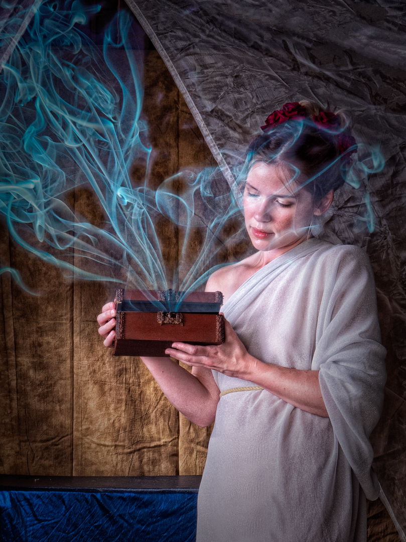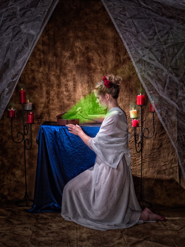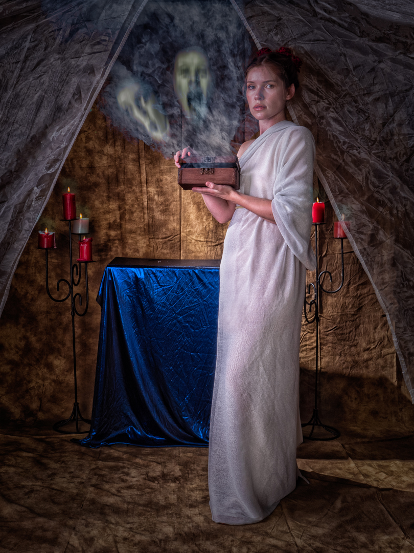 For the images where Pandora was looking into the box I positioned a speedlight in a snoot at the edge of the frame. This was aimed it Mandy’ face.