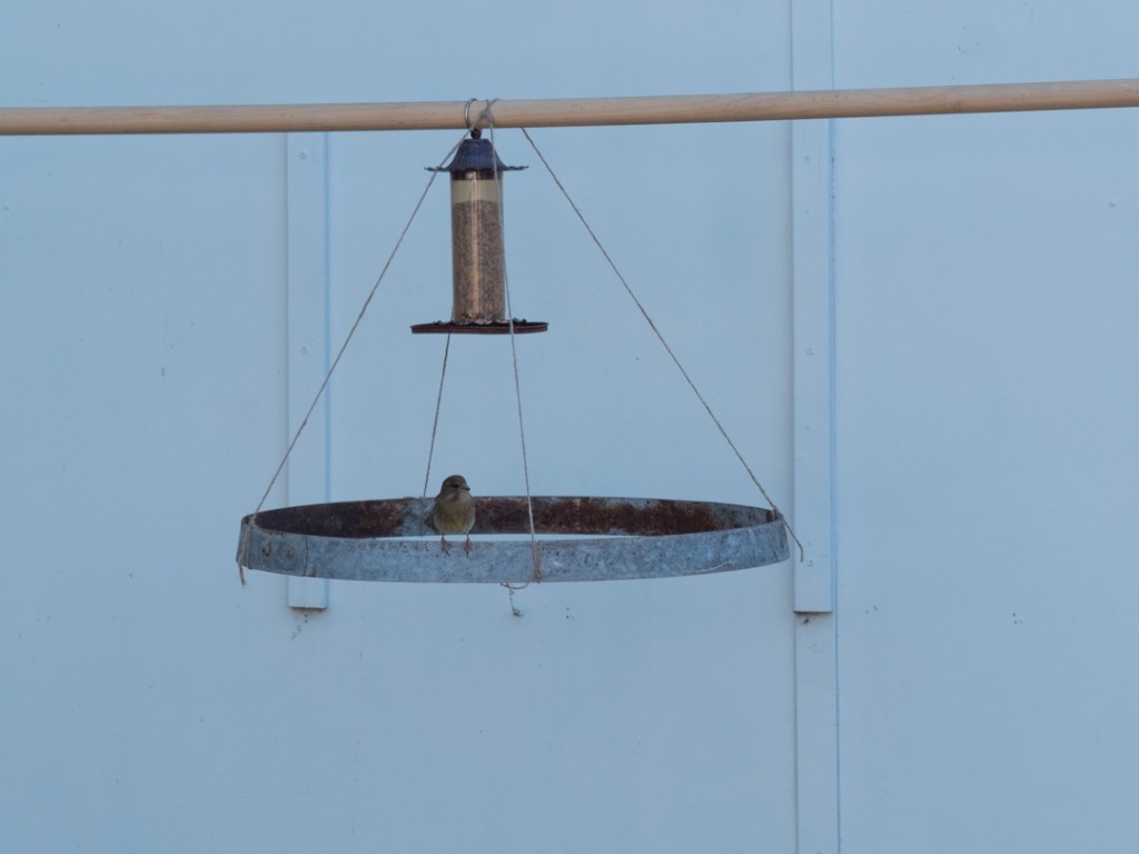 I knew that would have to clearcut the birds out of their background so I tried to make it as simple as possible. In our backyard I set up a frame in front of our old garage that has plain walls. From the crossbar I placed a feeder and then suspended the ring below it. I figured that birds would land on the ring before going up to the feeder.