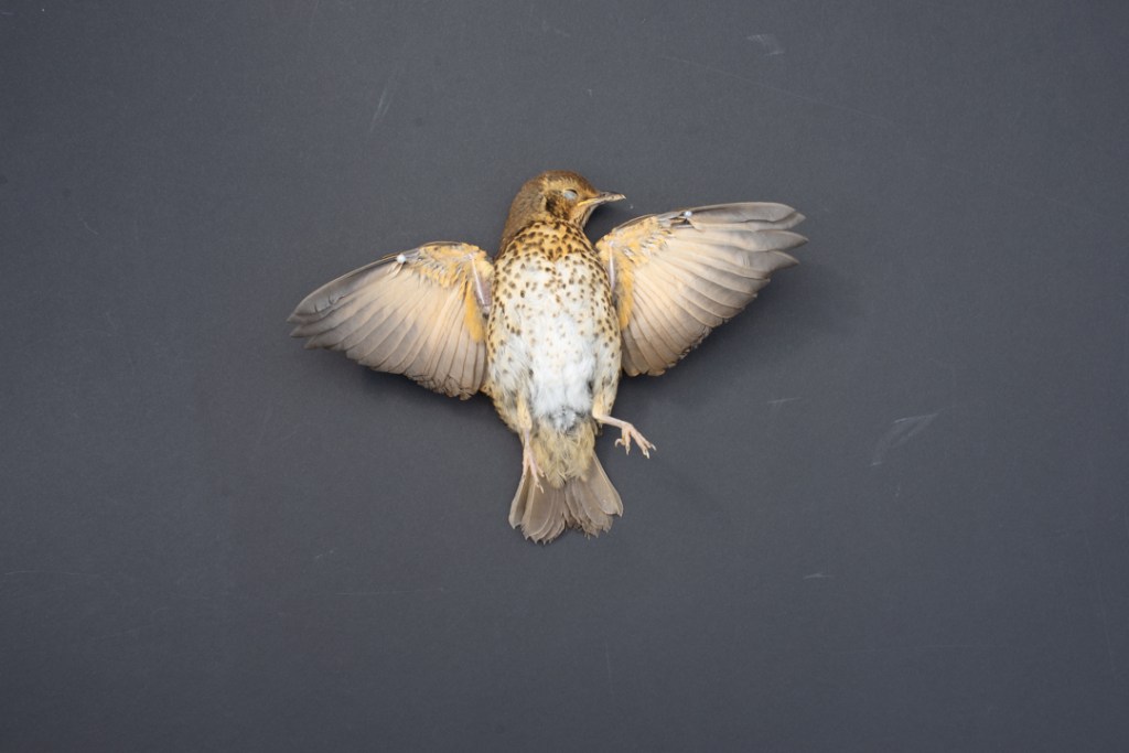 That proved to be not necessary. When we returned from a Saturday morning walk I discovered that a young thrush had flown into our bedroom windows and broken its neck in the process. Before I disposed of the body I positioned it on a black piece of card and insured that the light direction matched how I had photographed the birds.