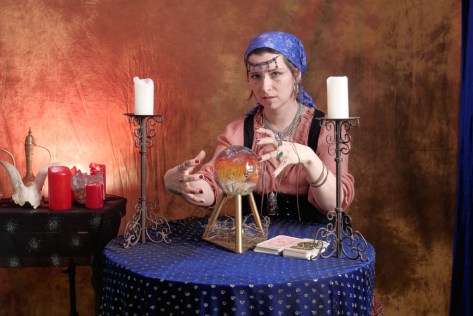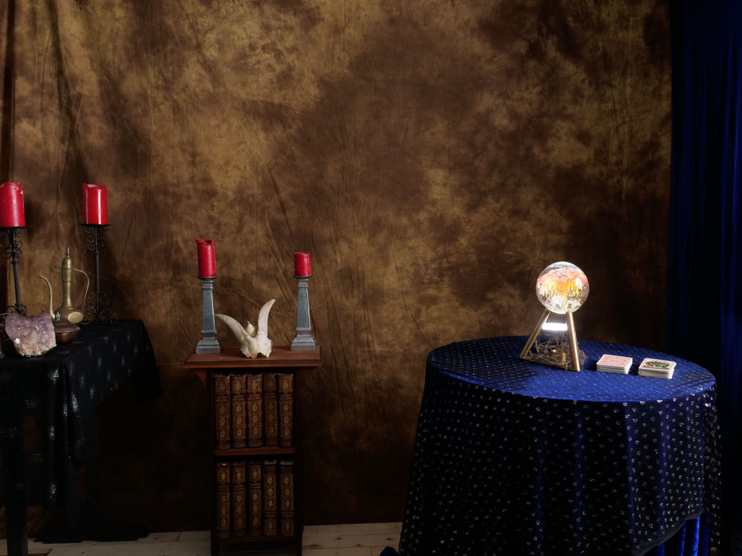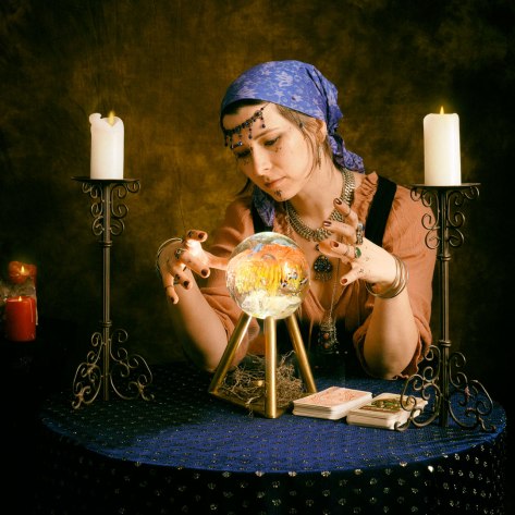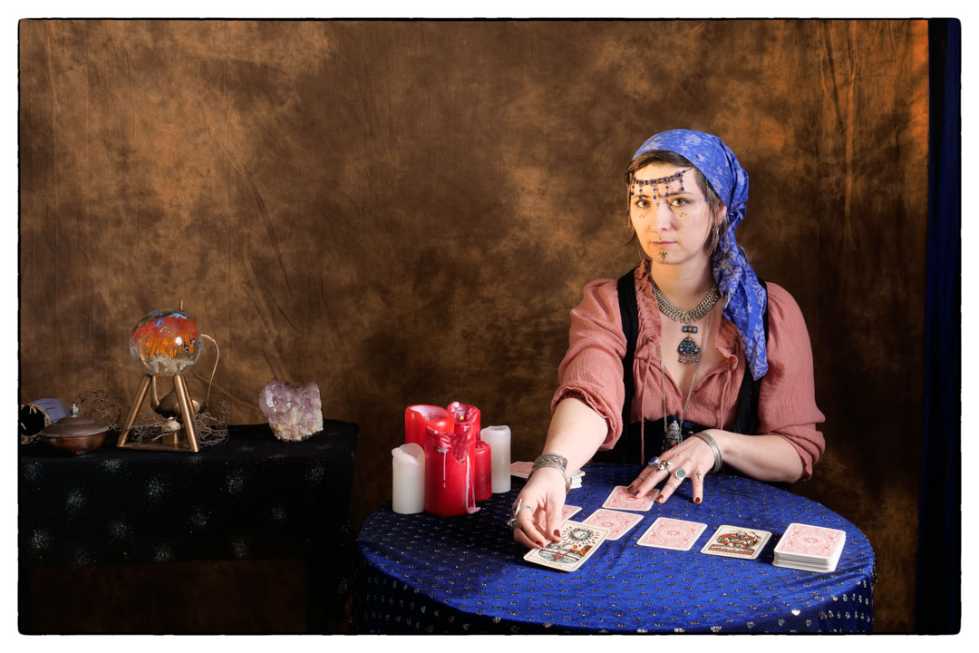 Generally speaking if I go to the effort to build a set and arrange a model, I will try to get more than one look out of the shoot. So when Neena came out for the Fortune Teller we decided to not only do a series with the crystal ball, but also ones with tarot cards. These I had borrowed from my daughter.