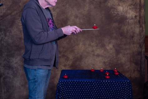 Now it would have been possible to use a single candle and move it around, however we did not do that. I wanted it to look authentic by using individual candles. Once we had the floating shot the candles were placed on the table and lit. Then we used a set of prongs to lift each candle in position.