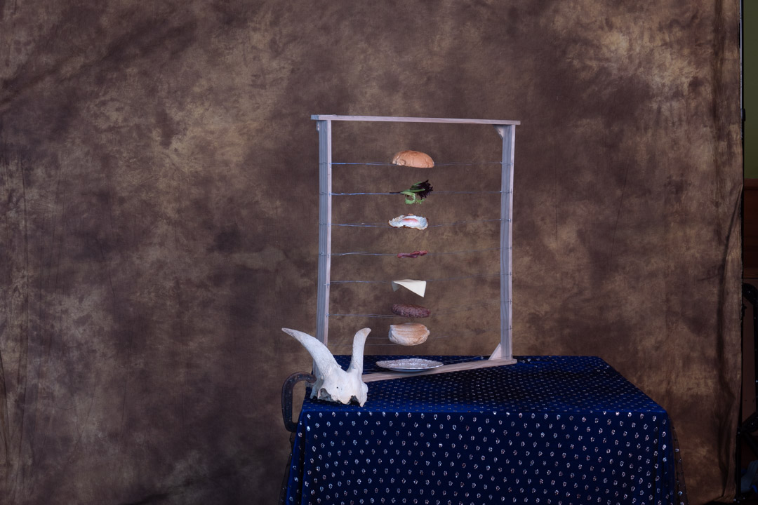 The first task was to assemble the props. The levitation of the food is done by building a frame and placing the individual levels on wire.