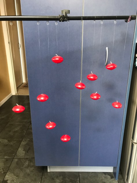 While not shown in the initial layout I decided that I wanted to add some floating candles to the screen. I managed to locate some cheap in the thrift shop and using nylon I tied them onto paper clips. This meant that they could be transported with tangling.