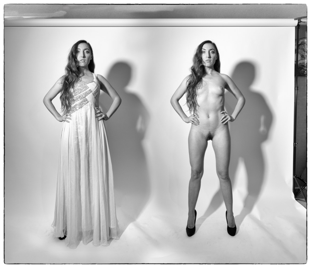 It was there a matter of getting here to do a number of strong poses. As my usual practice I was shooting tether to the computer. Once the clothed shots were taken, we reviewed them in the computer, and chose the ones that we wanted to repeat nude.