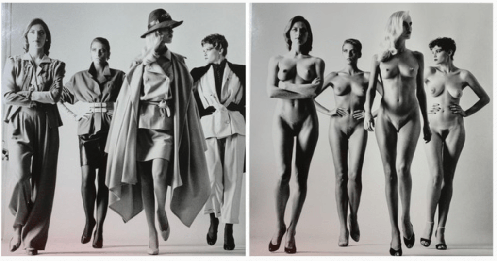 The first look I set out to recreate was an image entitled “They Come” shot in 1981. In his original image helmet had photographed four models in the latest Vogue fashions he then got them to repeat the same pose except they were fully nude.