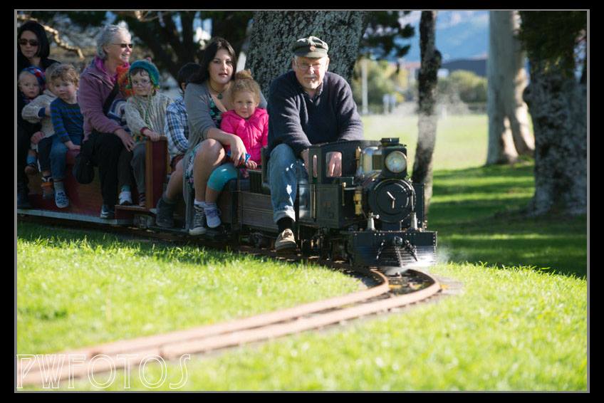 At the back of one of the main parks in Upper Hutt is a model railway set. I am not sure what gauge it is set to but the trains that run on it are fully working steam train models capable of pulling small carriages that kids ride on. On Saturday I was in the park shooting kids play soccer and saw on the notice that the railway was to be in operation on the Sunday. I thought that this would make a great shot for my “Photo A Day” so on Sunday afternoon I made my way down there.