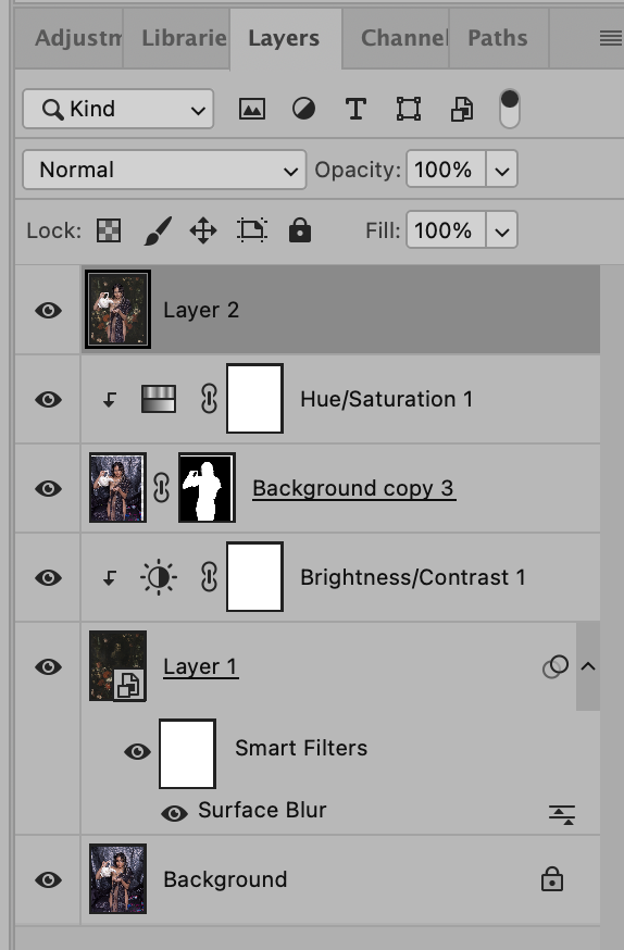 It was now time to put the concept together. In Lightroom I selected the background and the image of Tanisha. I then got the program to open them in Photoshop as separate layers. The layers are shown below.