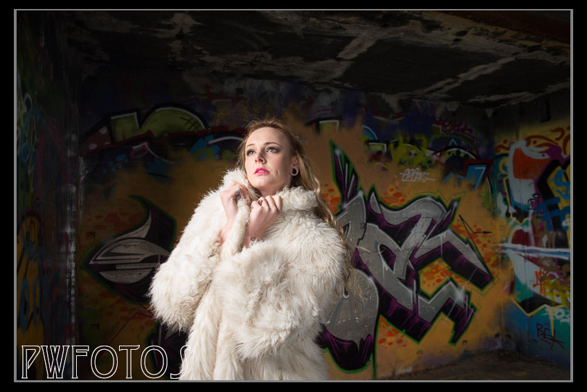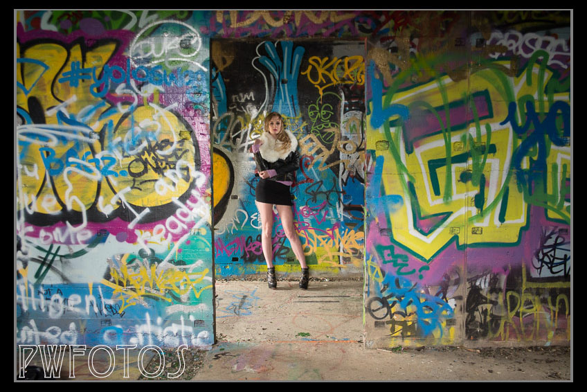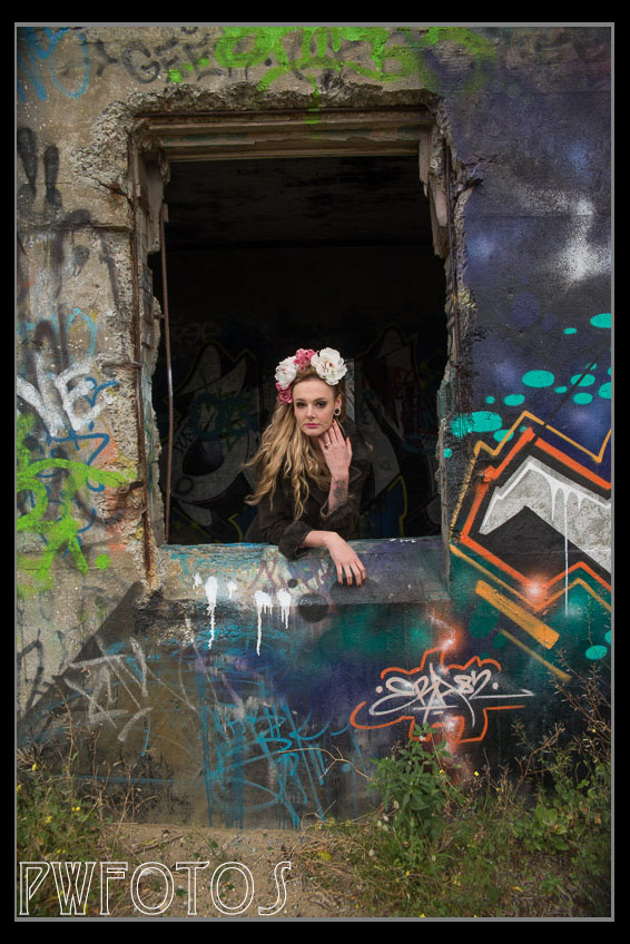 Palmer Head sits at the southern end of the Miramar peninsula and has great views over Cook Straight and the entrance to Wellington harbour. As such it was the obviously point for the placement of a gun emplacement in World War 2. The guns have long gone but the concrete buildings remain and thanks to graffiti artist are covered with a very colourful array of designs. The moment I saw them I wanted to shoot there. The opportunity came last Saturday with a shoot with Megan. She had a concept of a look that she wanted and I had agreed to shoot it. The look she was going for was actually based on nature but unfortunately the light on the day was not great and it was really the wrong time of year for much natural colour from the plants. In many of my shots I have actually worked with opposites and I saw this as a good option so we headed up to the gun emplacement. As often happens in Wellington the wind blew and being on an exposed headland meant that we were hit with the worst of it. Even inside the building there was a fair breeze going round and we ended up using a reflector as a wind shield so Sophie (makeup artist) could apply false eyelashes.