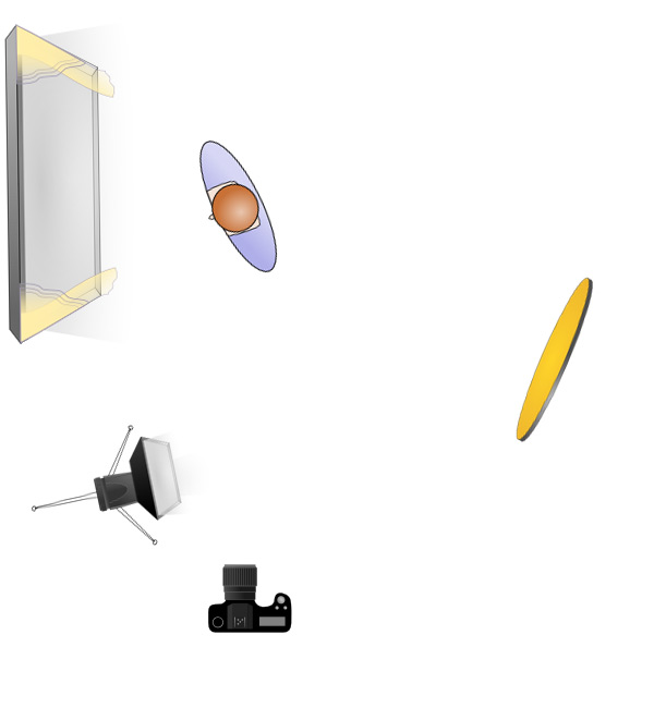 I used a very simple two light setup with a large 1m Softbox camera left and high being the main light with a small 40cm Softbox set camera right and positioned lower down.