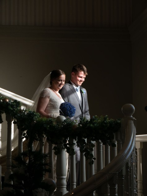 I positioned myself at the bottom of the stairs and Samantha shot across the room from a distance. There was a point half way down where light was flooding in from a large window and Samantha managed to capture them as they came through the light. The couple absolutely loved this image.