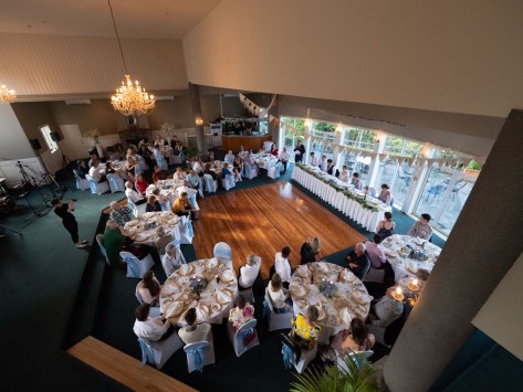 The stairway gave us the advantage to get some higher angled shots , and I also packed my wide angle Olympus lens so that I could capture the whole reception area. Normally windows behind the bridal table are a nightmare to shoot with and I had anticipated needed to use flash to capture images of the speech. As it turned out the sun was coming in through the high windows on the opposite side of room lighting the table from the front. This gave me workable light until much later in the evening when I had to resort to flash.