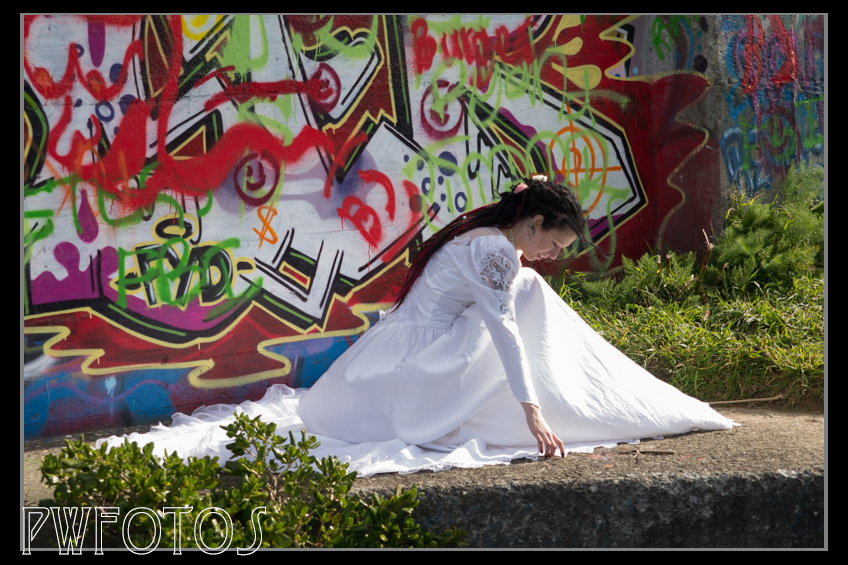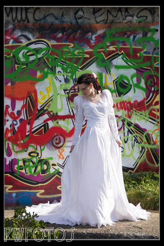 The second outfit that Kristara and I shot at Palmer Head was a old style lace and satin wedding dress. I bought it some time ago for a “trash the dress” shoot but it ended up not being used. Rather than shoot inside the building this time we shot outside starting with the backdrop of the graffiti walls and then on one of the roofs. The latter location enabled me to bring in a more natural background to the shots.